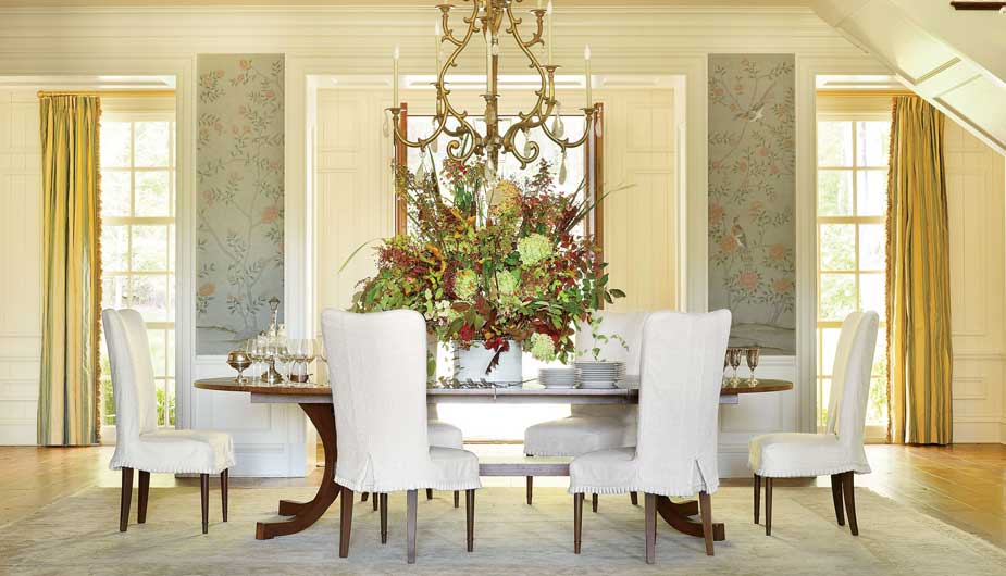 A sturdy wood table steals the show in this classically inspired dining room. The 1944 Wishbone chairs (by Hans Wegner) reinforce the traditional inspiration but utilize a gorgeous matte black color theme to bring them in like with contemporary trends.