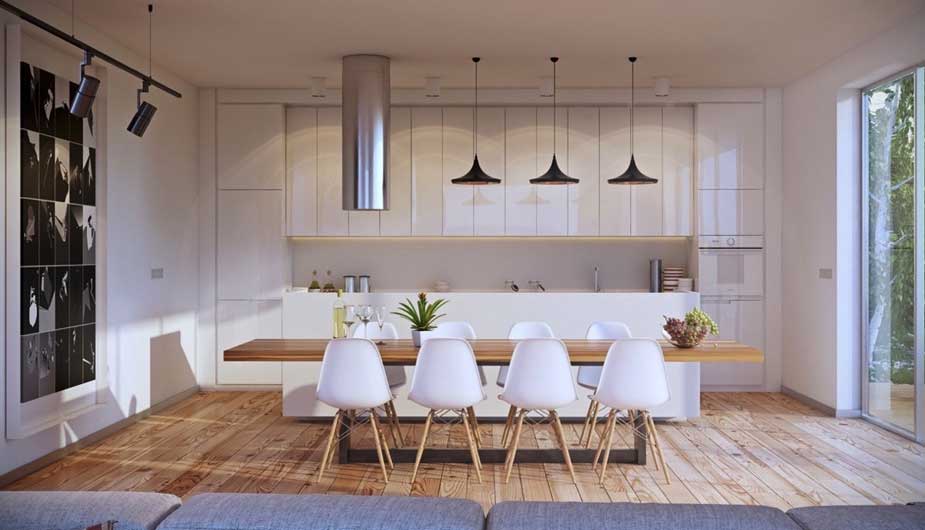 A simple kitchen and dining combination — this space uses a combination of traditional and classic materials to create a bright and spacious area anyone would love to occupy. Clean, functional, and delightfully subdued.